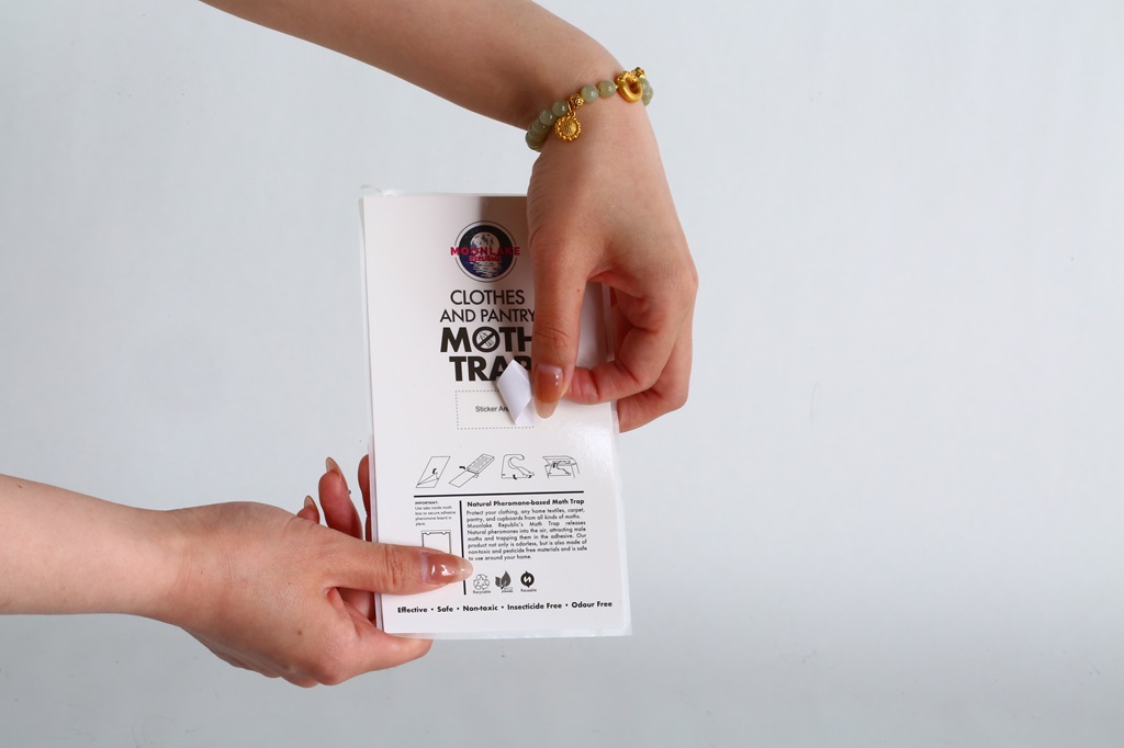 Congratulations on your purchase of a set of Moonlake Republik Moth Traps for Clothes & Pantry with Pheromones. This all-natural pheromone-based moth trap collection can be hung in clothing closets or food pantries. The pheromone draws in moths with an odorless attractant that interrupts their breeding cycle. Moths enter the trap but can’t get out!  Your new traps are super-convenient, easy to assemble and hang easily for long-lasting peace of mind.
